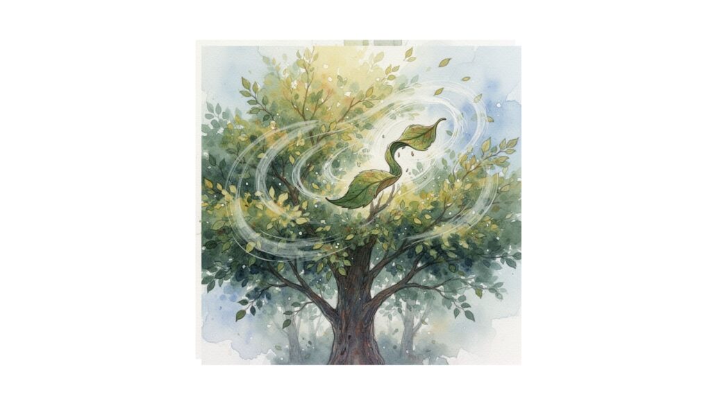 Die anderen Blätter am Baum ermutigten es immer wieder, gemeinsam mit ihnen die Sonnenenergie aufzunehmen, und mit Wind und Wetter zu spielen. Doch alles war vergebens. Es blieb ein Außenseiter, der nur dachte – die Sonne verbrennt mich, der Regen macht mich nass, und der Sturm und Wind reißen mich vom Baum.
