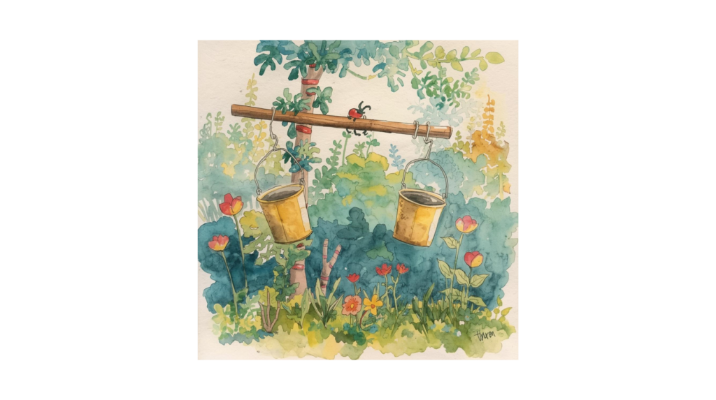 die von den Enden einer Stange hingen, die sie über ihren Schultern trug.