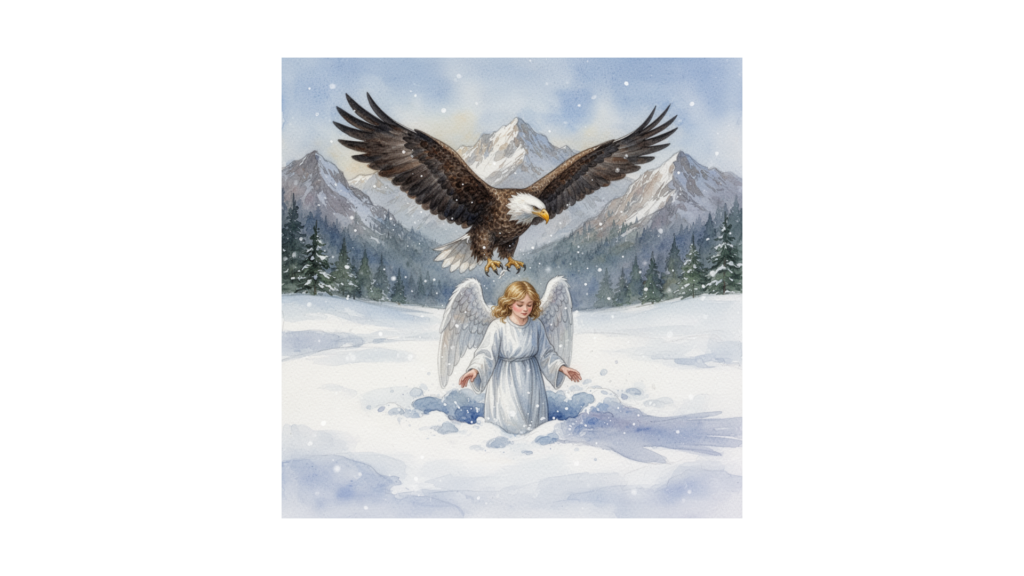 Der Hirte konnte den kleinen weißen Engel im tiefen Schnee nicht sehen. Der Adler hüpfte dorthin, wo er das Engelchen abgesetzt hatte. Jetzt sah der Bartl eine kleine Mulde, und darin lag das Engelchen, mit seinem gestauchten Flügeln.