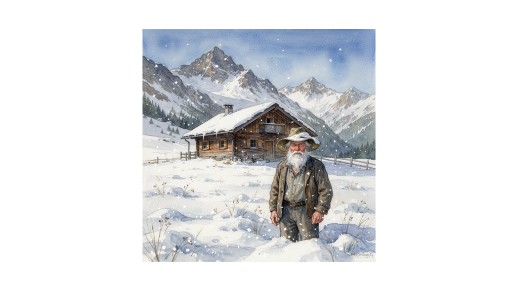 Der Steinadler hatte das Engelchen in die Nähe der Almhütte in den Schnee gesetzt. Das himmlische Wesen erholte sich währenddessen etwas von seiner Angst. Der Adler hüpfte zur Hütte und klopfte mit seinem Schnabel an die Hüttentür. Er klopfte 3 x und noch 3 x. Das war das Zeichen, das ihm der Hirte einmal gelernt hatte.