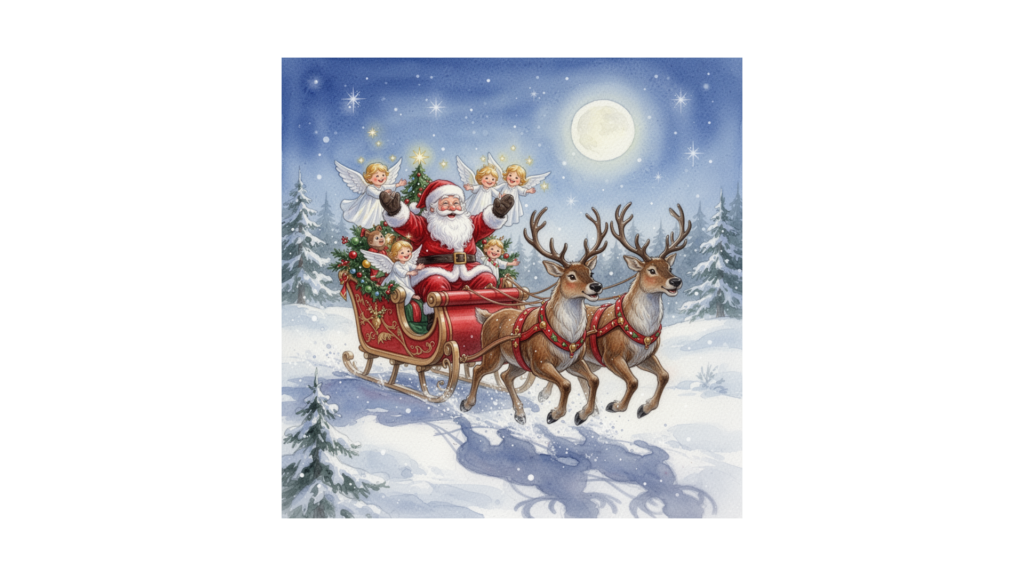 Im Himmel droben hatte doch jemand den Absturz vom Engelchen beobachtet und sofort Alarm ausgelöst. Der Nikolaus nahm gleich sein Himmelsgefährt, den Schlitten mit seinen Rentieren und rief seine Helferengel zusammen. Sie machten sich auf die Suche nach dem abgestürzten Engelchen mit den rosa Flügeln. Sie sahen gerade noch, wie der Adler den Engel mit seinen Krallen auffangen konnte und wo er damit landete.