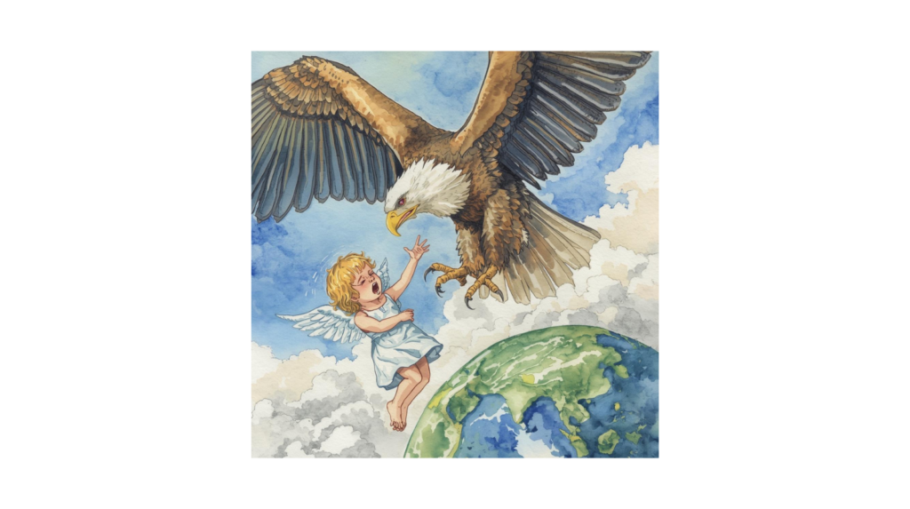 Der große Vogel war ein Steinadler. Wie er gerade seine Kreise immer höher und höher zog, sah er plötzlich etwas von einer Wolke herunterrutschen. Er sah genauer hin und erkannte, es war ein Engelchen, das nun in großer Gefahr war. Durch seine Schockstarre konnte das Himmelswesen nicht mehr fliegen.
