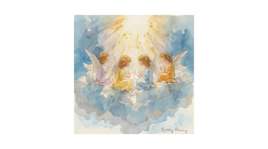 Es war so schön hier auf dieser Wolke. So ein toller Aussichtsplatz. Hier konnte es ganz weit in den Wolkenhimmel hinein und hinaus sehen. Das kleine Engelchen mit den rosa Flügeln lehnte sich weit nach vorne, um besser zu den unteren Wolken sehen zu können – auf denen gerade andere Engel zum Ausruhen landeten. Als der Kleine sich zu weit nach vorne beugte, um mehr zu sehen, begann die Wolke zu kippeln. Das Engelchen rutschte von ihrem Platz auf der Wolke nach vorne und diese geriet immer mehr ins Schwanken und Schaukeln.