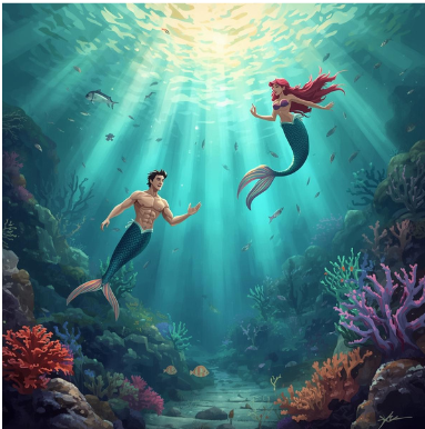 Frisch aufgefüllt mit Sternenenergie, stand er auf seiner Schwanzflosse, die er so hinstellte, dass er menschenähnlich aufrecht stehen konnte. Die rechte Schwanzflosse nach vorne und die Linke nach hinten gedreht, so stand er sicher auf dem Felsen. Seine Muskulatur spannte sich noch mal unter seiner Haut und mit einem Meeresgottwürdigen mächtigen Satz, sprang er vom Felsen hinein in sein Element, das Wasser.