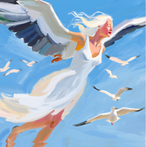 Ich bin Fricka, die Sängerin, eine weißgraue Möwe und lebe – seitdem ich aus meinem türkis gesprenkeltem Ei mit allen meinen Geschwistern gleichzeitig schlüpfte – im Regenbogenland. Ich bin Tillas flugbegleitende Freundin. Wir zwei kennen uns seit 20 runden Monden und fliegen oft zusammen aus, wobei ich jedoch keine so schneidigen Loopings wie Tilla auf ihrem Besen mache, jedoch sehr gerne begeisterte Rufe ausstoße, wenn der Aufwind unter meinen Flügeln mich gleiten lässt; sodass man uns schon von Weitem herannahen hören kann.