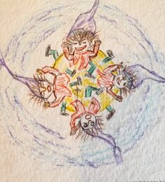 „Die Schöpfereltern haben wohl ihren Plan nicht so richtig durchdacht – was?“ platzt es nun aus dem kleinen Tzapepazt heraus. „Ma Erde du sagst doch immer, zuerst alles zu Ende denken und dann handeln! Haben die beiden großen Eltern, dass denn nicht so gemacht?“ – „Tja weißt kleiner Mann, manchmal denkt und denkt man … und dann meint man – es passt, wie es gedacht ist. Dann lässt man den Dingen seinen Lauf.
